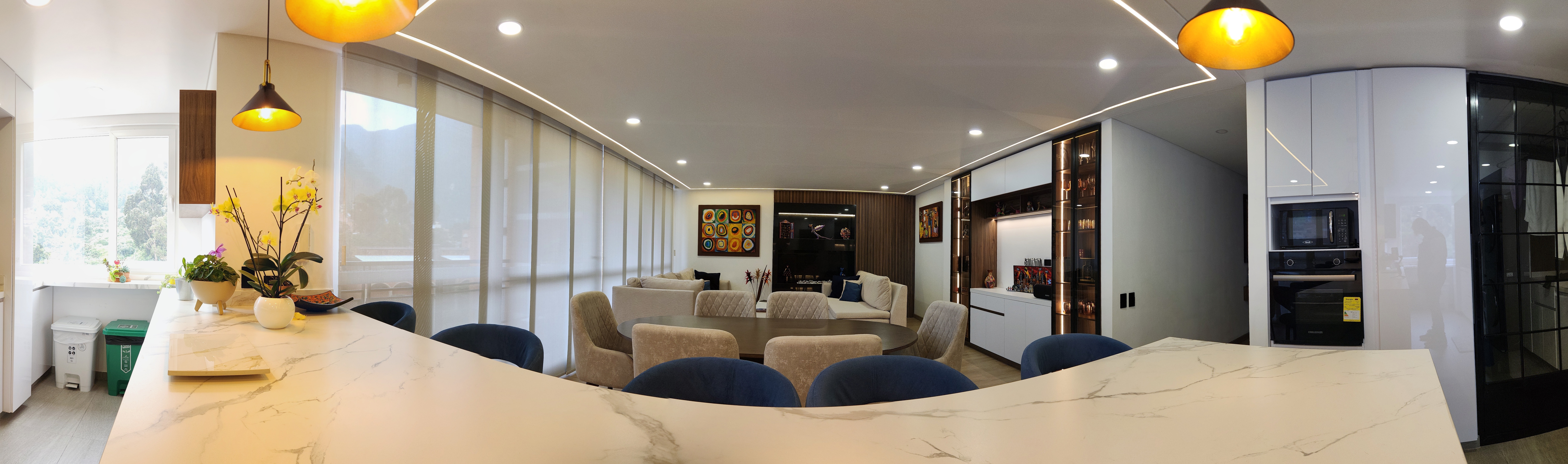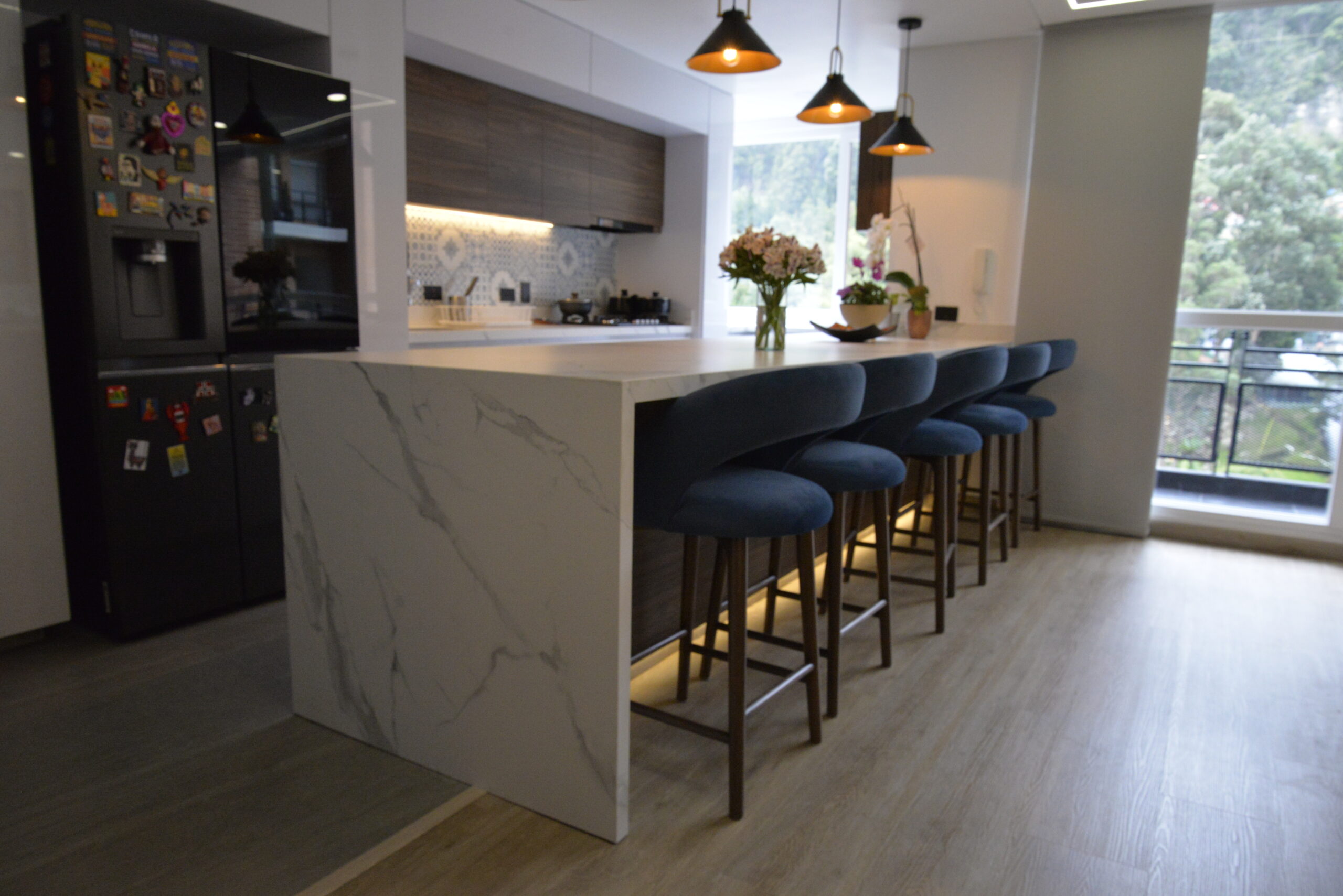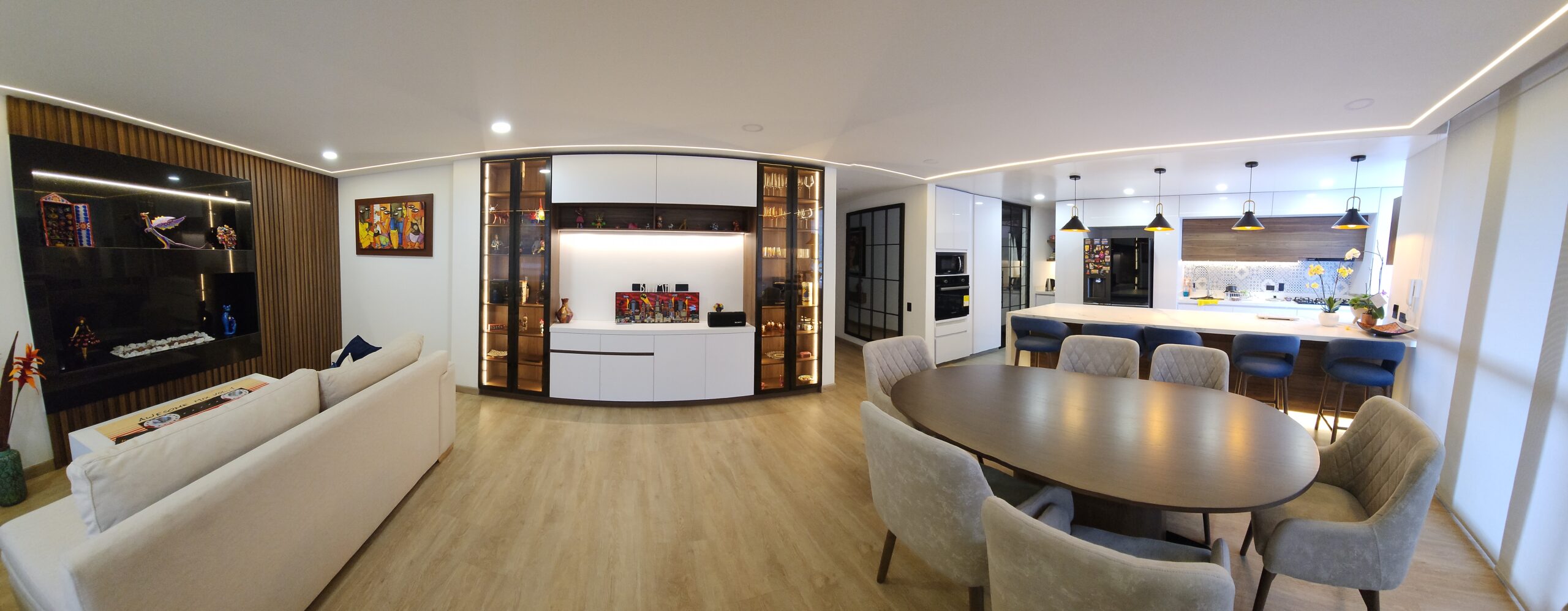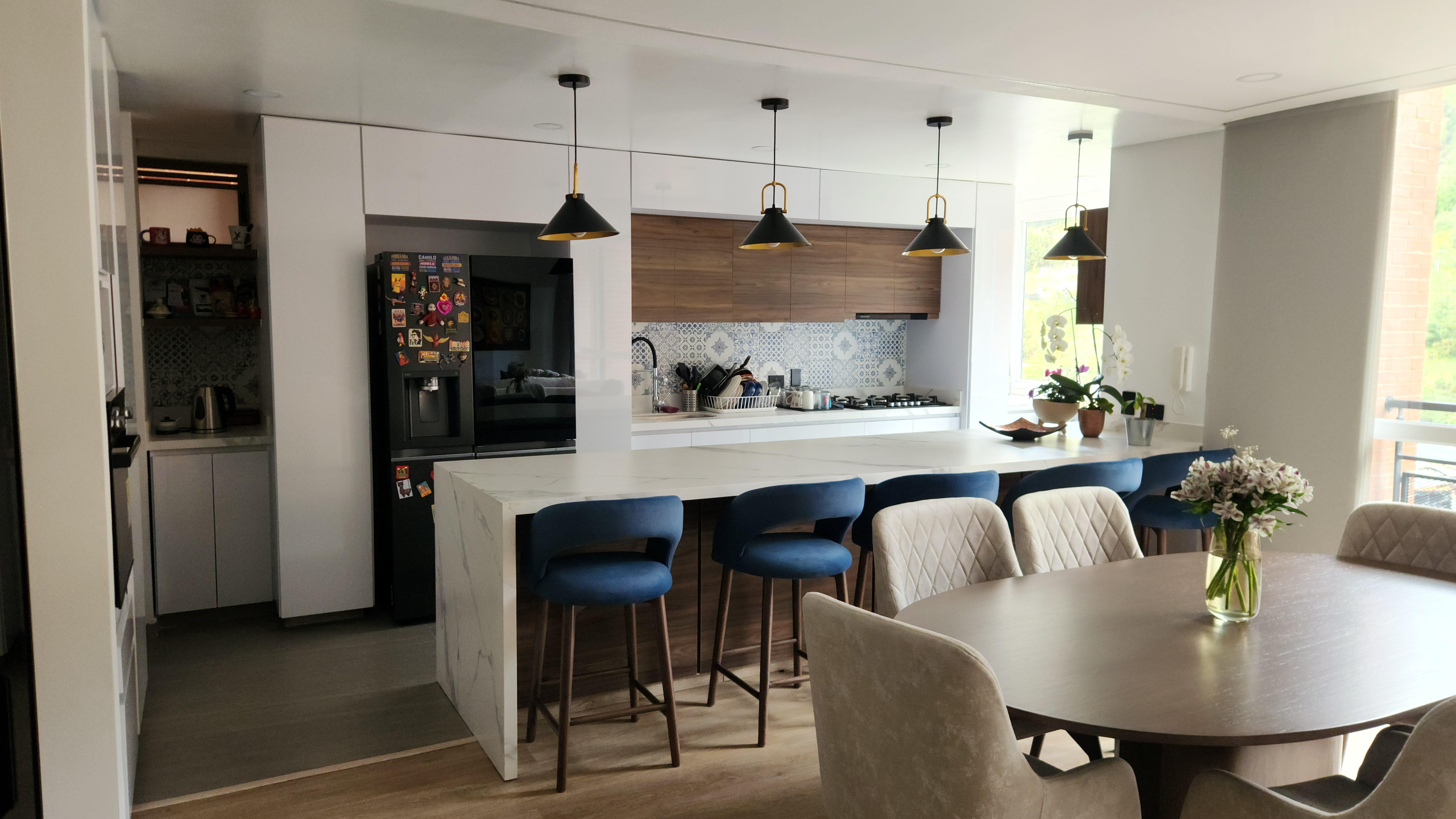 El Desafío: Erradicar los problemas de temperatura extrema del apartamento y maximizar cada metro cuadrado para una familia que buscaba integrar su cocina con la sala y crear espacios con personalidad propia.